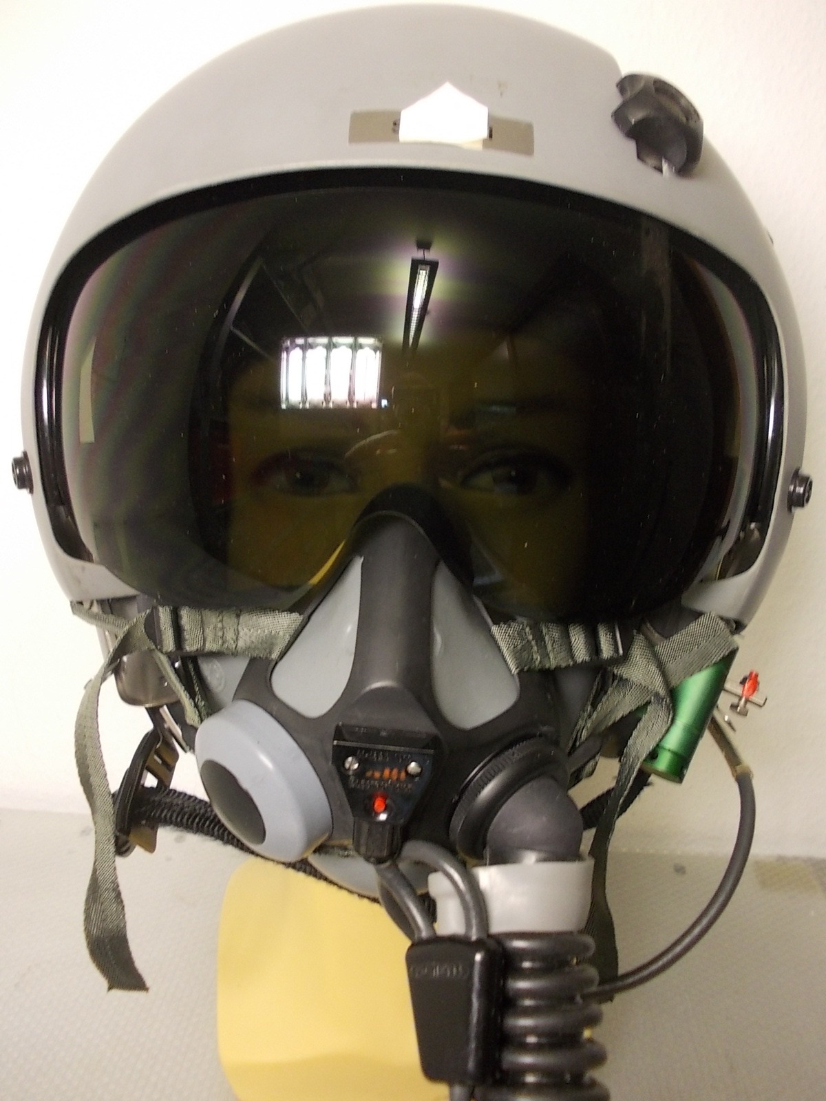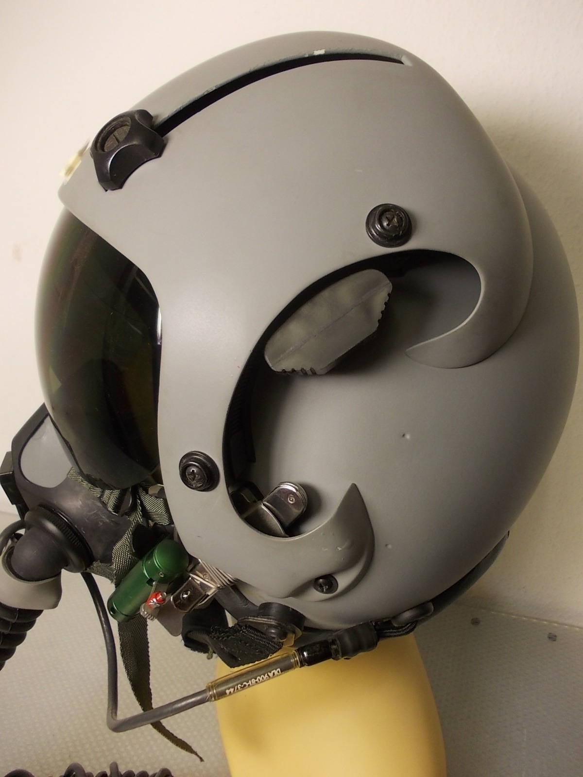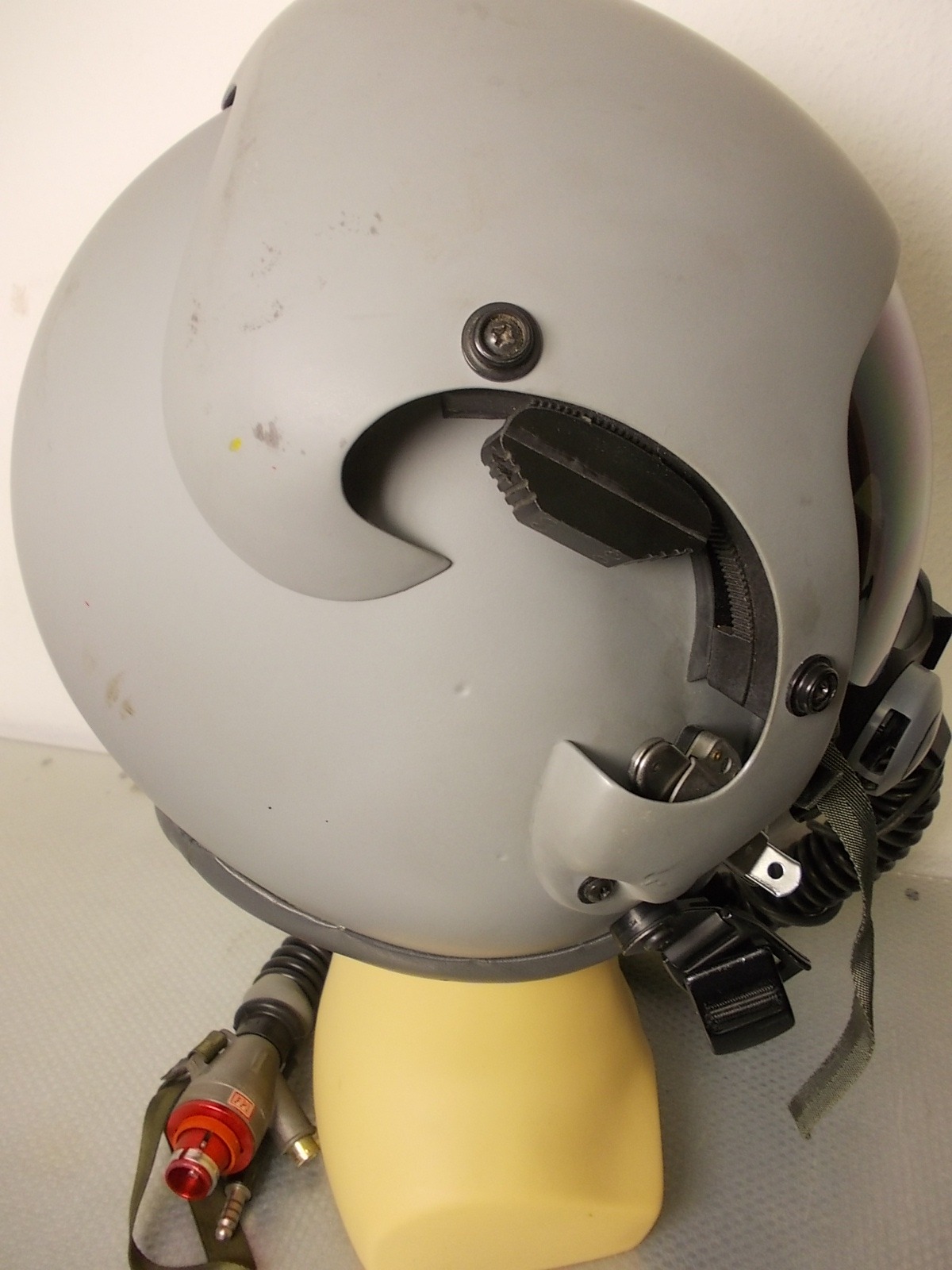Original German Tornado Fighter Pilot Helmet HGU 55/G Flight Helmet with MBU 20/HALP mask and „WEA“, ,the WEA device is mounted at the left-hand side bayonet,the WEA (Wasser Entriegelungs Aktivierungseinheit) is a water activated opening device,this device contains a tablet that solves in water and that activates a spring to push the bayonet from the retainer, ,helmet size is Medium ,double visor dark and clear in very good condition, include a MBU 20/HALP mask with „WEA“ and black hose in size Medium Narrow ,complete with all avionic and plugs,chin strap (British model) quick disconnect type, no nap strap, gray fighter jock leather earcups , TPL liner, normal lightweight recievers,complete with all avionic and plugs , communications cord is the standard CX-4708A/AIC cable ,helmet and mask are normal flight use but in very good original condition,Unfortunately, the leather Edge Roll has a damage to the surface of the leather on the left side (see picture), Please note that all our items are pure collector items or display items. The items are not tested for real use and have no aeronautical exams or clearances. Use is at your own risk !
